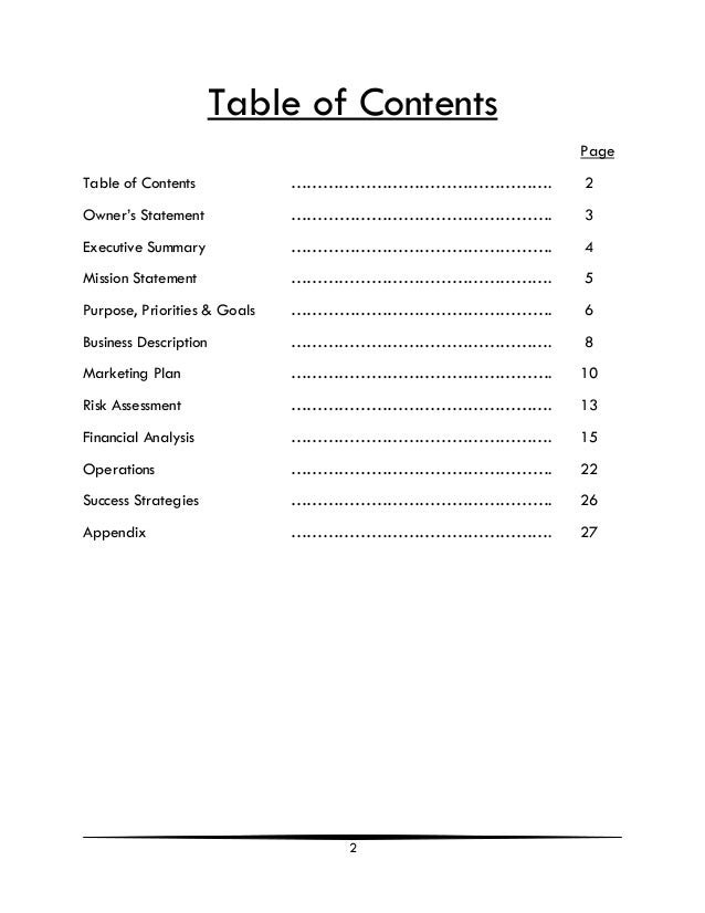 How to use business plan sample templates; Does your busness plan really need a table of contents? Explains the rest of your business plan in about. Contents of a written business plan. Table of contents the table of contents helps readers go directly to the information they wish to examine. The table of contents and table of appendices should refer the reader to the sections and subsections of the business plan. Participants must decide about the contents of the business plan, its structure and then allocate resources to it. The plan is necessary in the vast majority of cases: Cover page, executive summary, table of contents, etc. The executive summary should include: It helps provide an overview of what readers can expect to read within the business plan. The table of contents is a roadmap to help the recipient peruse the list and easily find each section. Business plan format guide a comprehensive business plan format guide.
